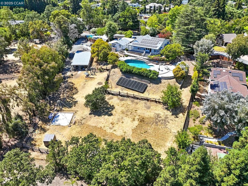 VERY RARE OPPORTUNITY TO OWN THIS PROPERTY ZONED R20 USED FOR HORSE/LIVESTOCK PROPERTY. A SPRAWLING MAIN RESIDENCE BEAUTIFULLY REMODELED WITH GREAT ROOM, CHEF'S KITCHEN, CUSTOM OFFICE, GLEAMING HARDWOOD FLOORS THROUGHOUT, INTERIOR LAUNDRY W/WALK IN PANTRY, TWO EN SUITE MASTER BEDROOMS; FRONT & REAR VERANDAS & SPARKLING POOL WITH 180 DEGREE BREATHTAKING VIEWS. SOLAR SYSTEM OWNED AND NEW CENTRAL HVAC SYSTEM. TRULY AN ENTERTAINER'S PARADISE SITUATED ON 1.16 ACRES. CLOSE TO ACCESS TO MT DIABLO STATE PARK & LIVORNA PARK END OF LANE. THIS HOMESITE IS SUBDIVIDABLE! ADORABLE COTTAGE STYLE ADU CURRENTLY RENTED SEPARATE FROM MAIN HOME. TENANTS IN COTTAGE HAVE RESIDED 5 YEARS + ALONG WITH ADU; STUDIO & 1/2 BATH @ BARN AND TWO STALLS WITH TACK & FEED ROOM.