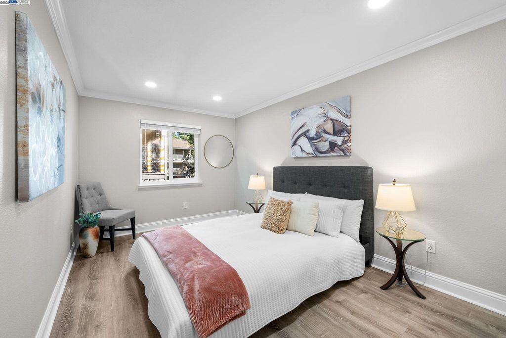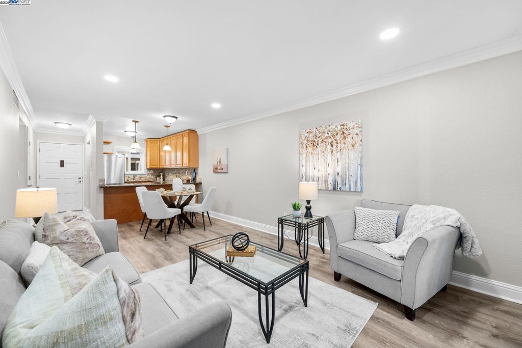 Come see this wonderful, completely updated, turn key one bedroom unit with an oversized one car garage. This property is perfect for so many of today's buyers. Conveniently located in Pleasanton with easy access to downtown as well as both the 580 and 680 freeways. Minutes from the ACE and the Pleasanton / Dublin Bart station. And the HOA fees are some of the lowest in town. On the interior you'll find an updated kitchen with granite counters, pendant lighting, new oven / range, new dishwasher, newer stainless fridge, new disposal. New windows throughout as well as a new rear slider that leads to the back deck which is perfect for your gas grill and lounging. Updated LED lighting in the living area and bedroom. Newer blinds throughout. An updated bathroom with newer toilet, vanity, light bar, washer and dryer. Entire unit has been recently painted with newer baseboards and crown molding as well. Garage features LED overhead lighting and has also been recently painted. Floor has been epoxied. An additional storage space is located behind the rear garage wall and the mounted cabinets and rollaway workbench make for an excellent work / hobby space. In addition there is a sizable separate storage locker that offers ample storage for all your extra knick-knacks. Come check it out!